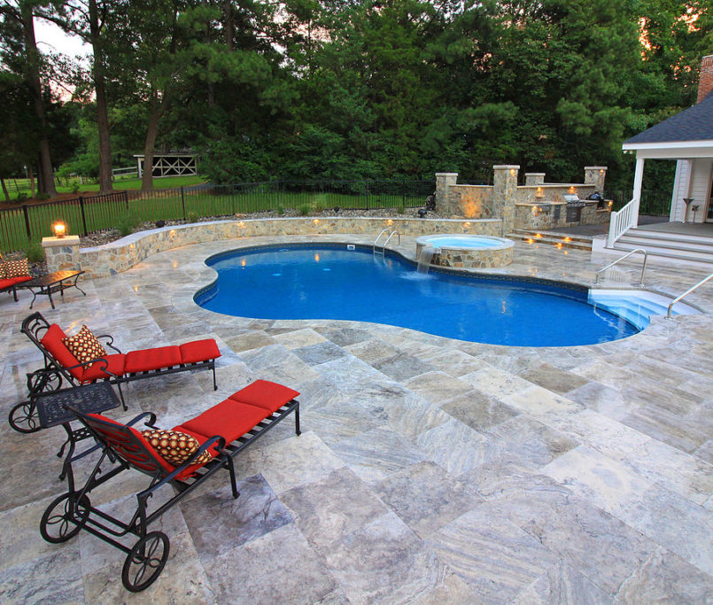 We took this countryside guest house and we turned it into a retreat. We focused the living space around the pool. The kitchen and firepit are on separate levels, but all lead back to the pool. The pool deck featured are 24″ x 24″ silver travertine pavers, with natural stone walls, and 4″ limestone column caps. The firepit and kitchen feature concrete pavers to help delineate the spaces.