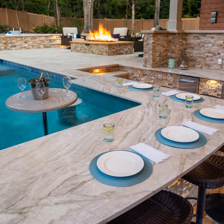 The homeowners first approached us with an idea for a backyard pool, cabana, outdoor kitchen, and firepit. Taking their hand-drawn sketch, our in-house designers created 2D and 3D renderings of what their backyard could look like, and began work after the approval process. As the project progressed, our creative team collaborated with the homeowners on an outdoor bathroom and storage building that would be entertainment-friendly. As we worked this building into the master plan and continued conversations with the homeowner, it became clear that more “dry” space was needed. So we once again tweaked the design plan to add a covered breezeway connecting the cabana to the bathroom along with other walkways that completed the backyard haven.