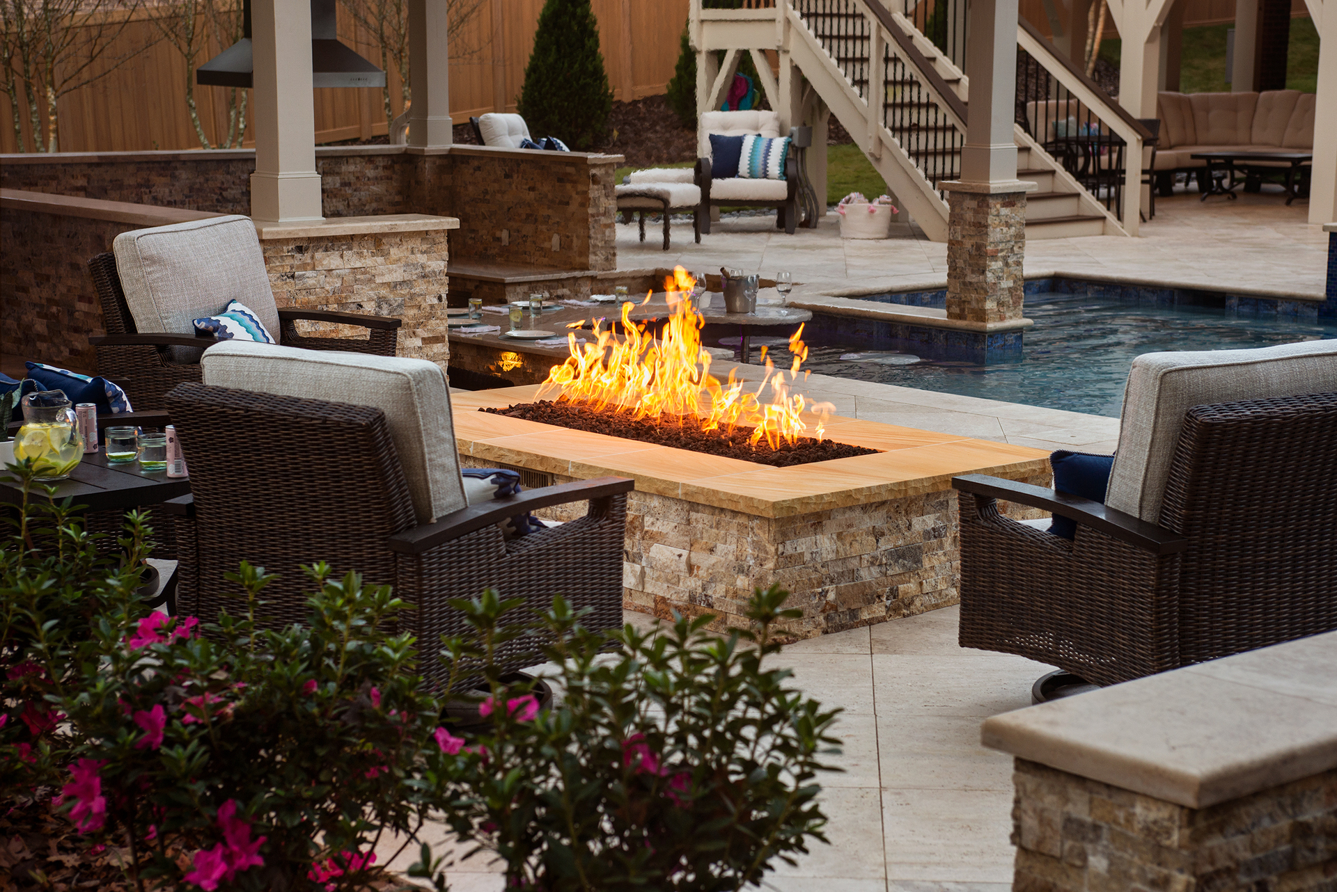 The homeowners first approached us with an idea for a backyard pool, cabana, outdoor kitchen, and firepit. Taking their hand-drawn sketch, our in-house designers created 2D and 3D renderings of what their backyard could look like, and began work after the approval process. As the project progressed, our creative team collaborated with the homeowners on an outdoor bathroom and storage building that would be entertainment-friendly. As we worked this building into the master plan and continued conversations with the homeowner, it became clear that more “dry” space was needed. So we once again tweaked the design plan to add a covered breezeway connecting the cabana to the bathroom along with other walkways that completed the backyard haven.