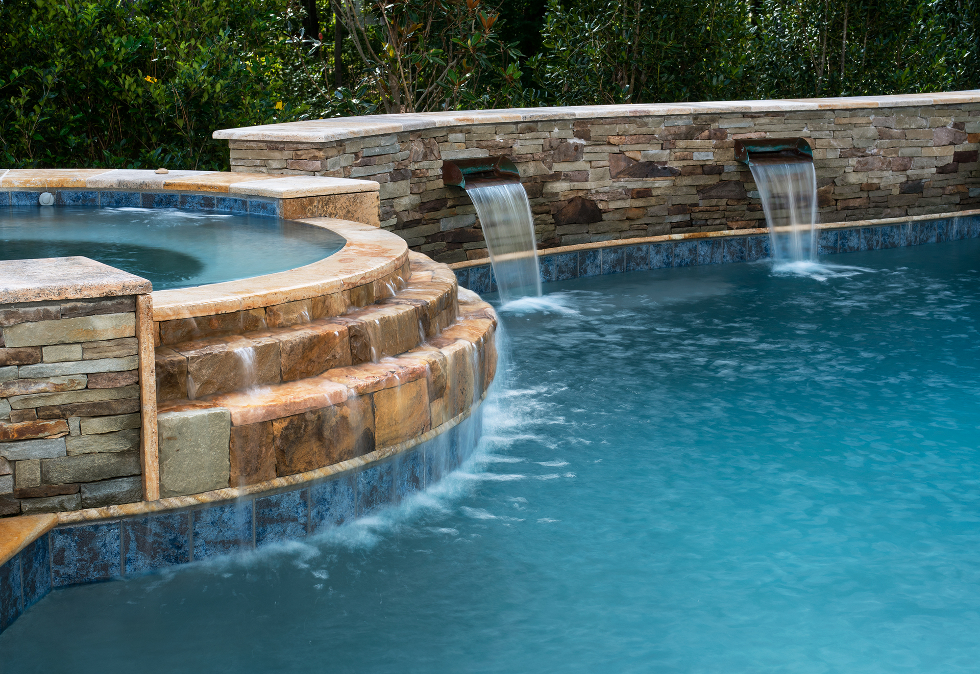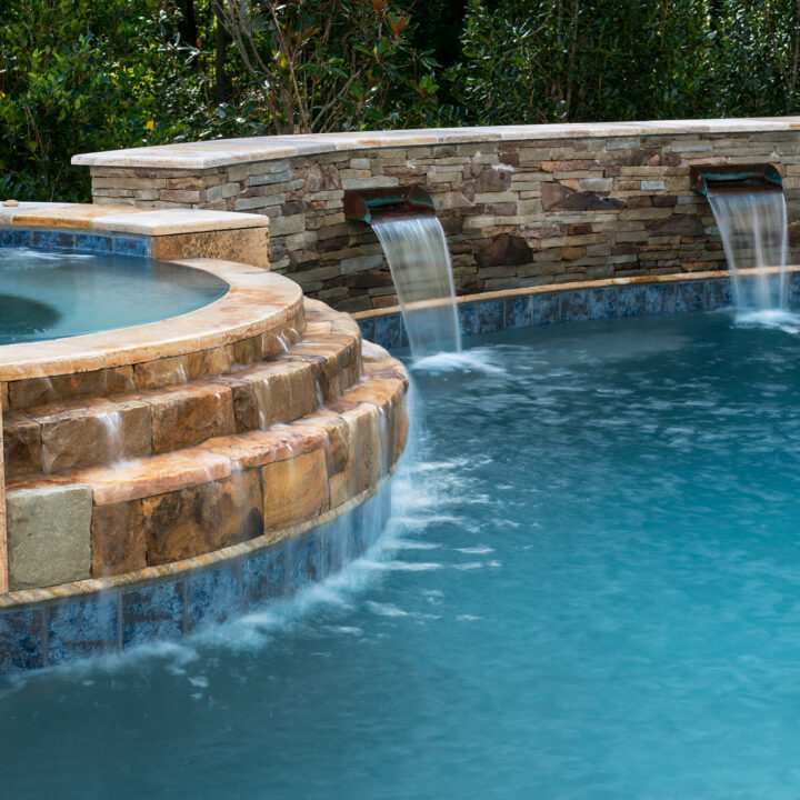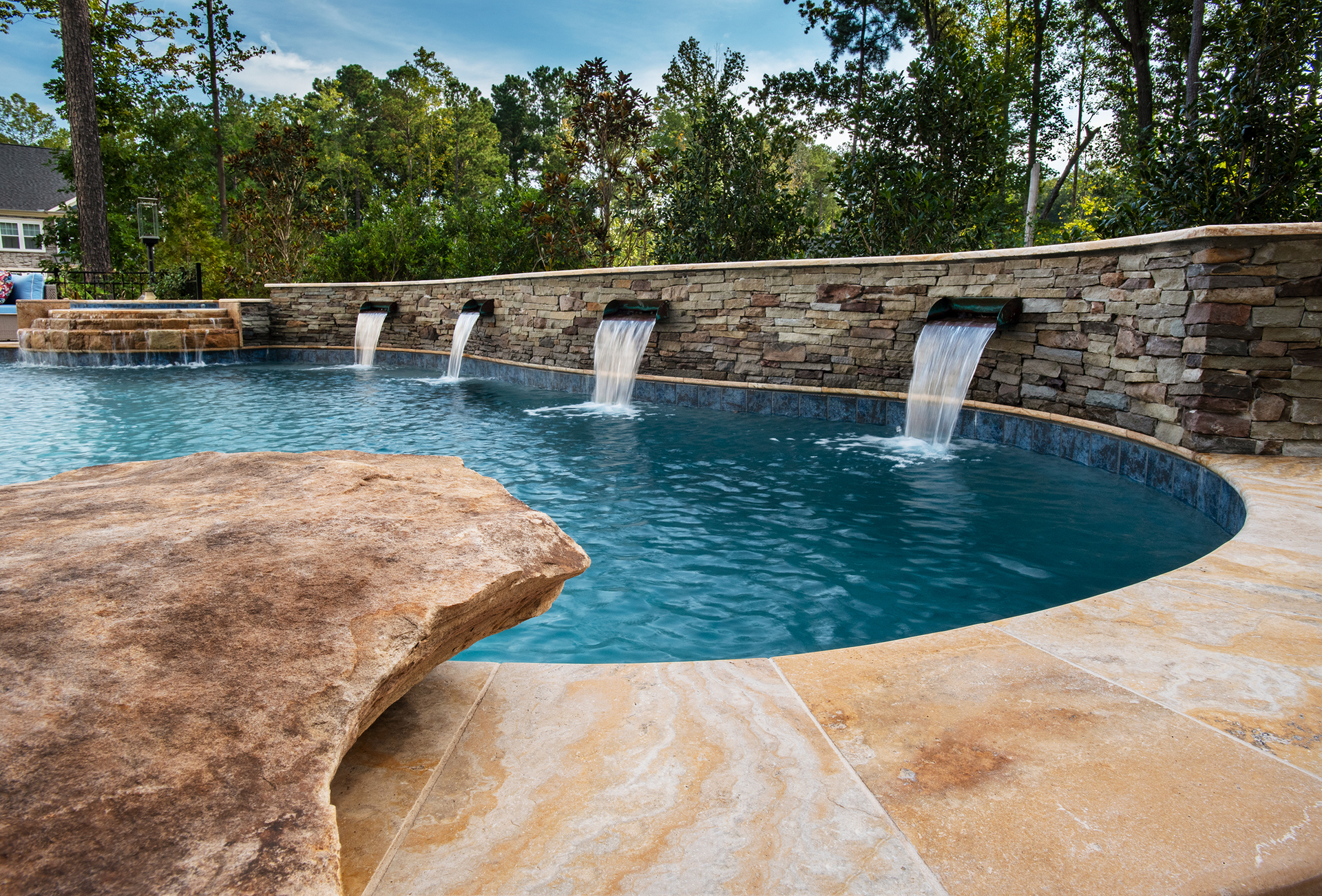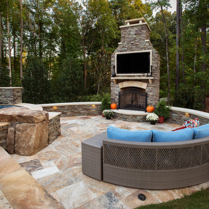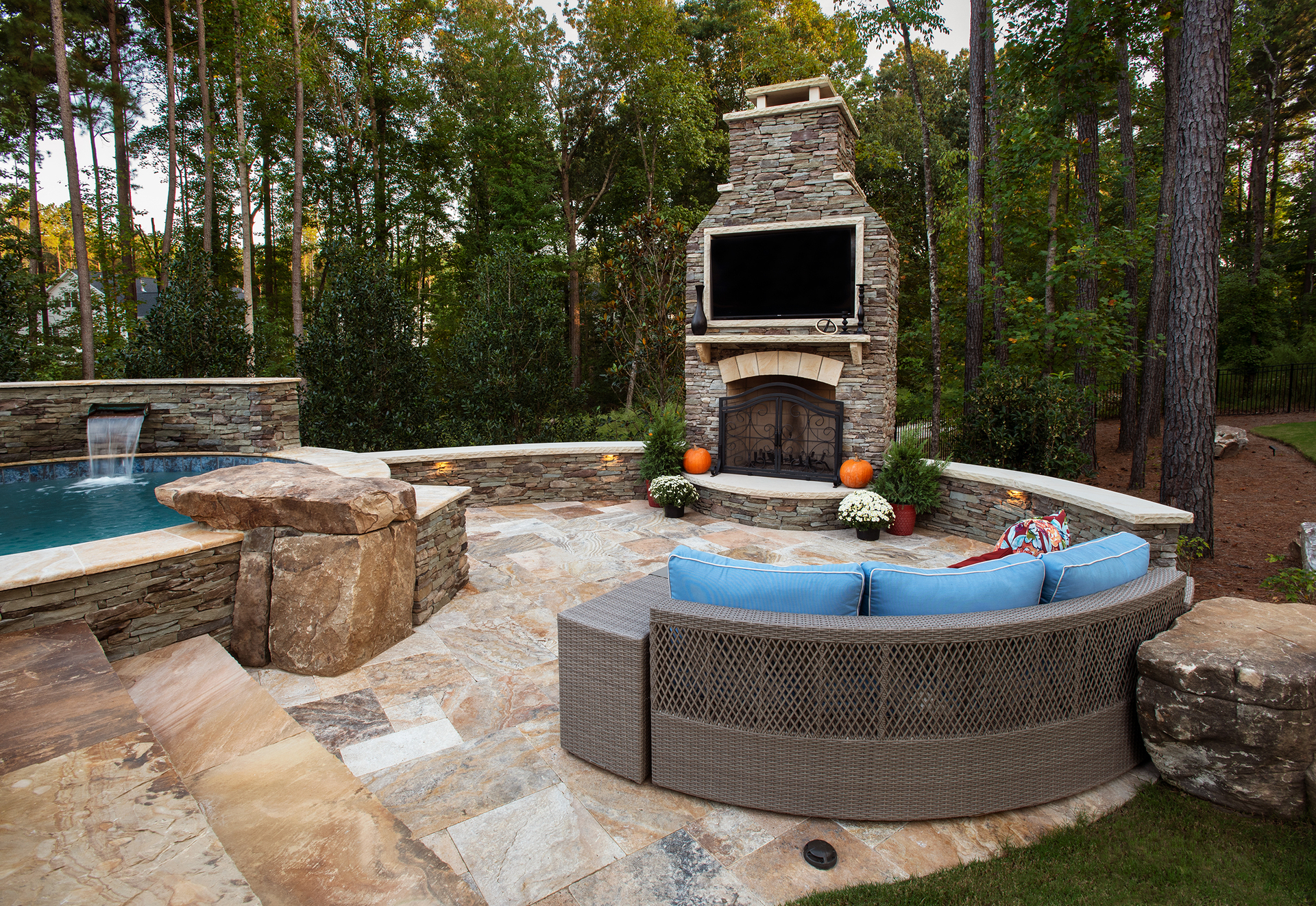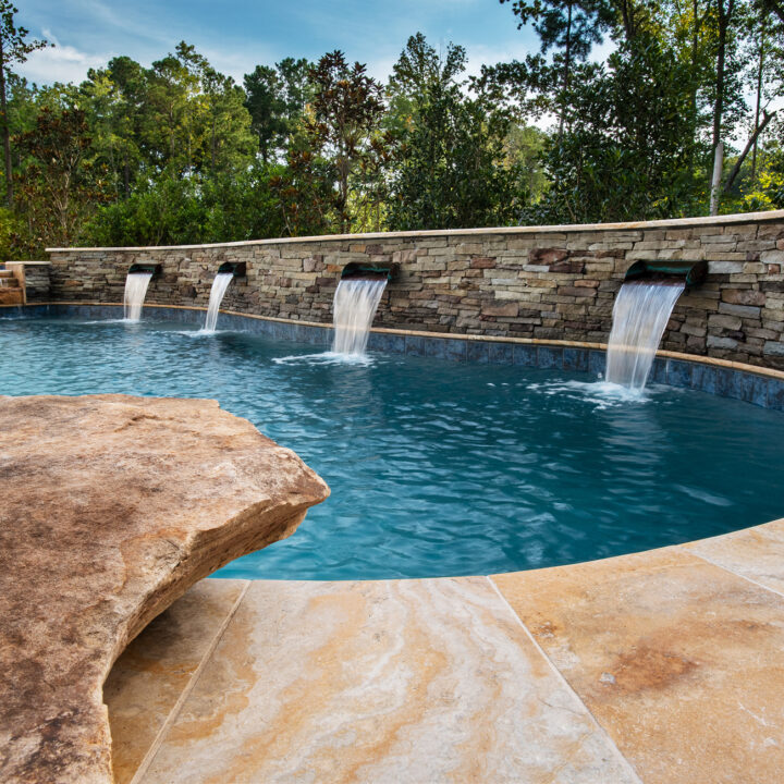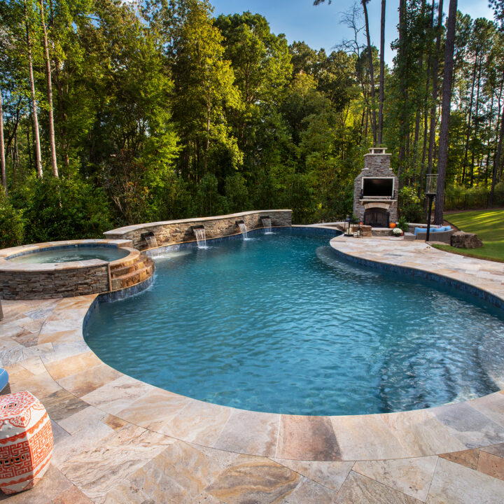 Most of our projects provide us with challenges, such as this property. We had a long road of testing soils, to moving septic lines, but at the end we were able to provide the homeowner’s with a beautiful pool, spa, fireplace, and entertaining area. Cappadocia travertine is the star of the show next to the pool.